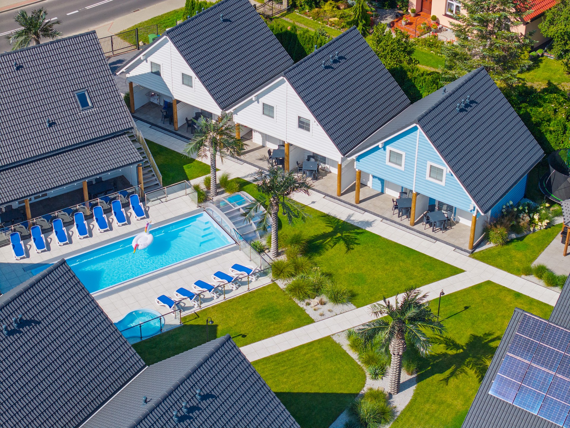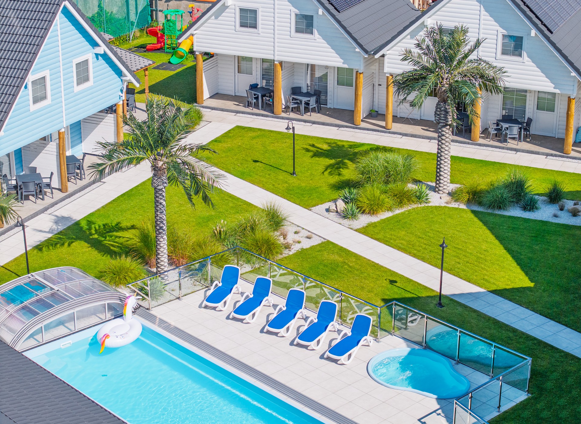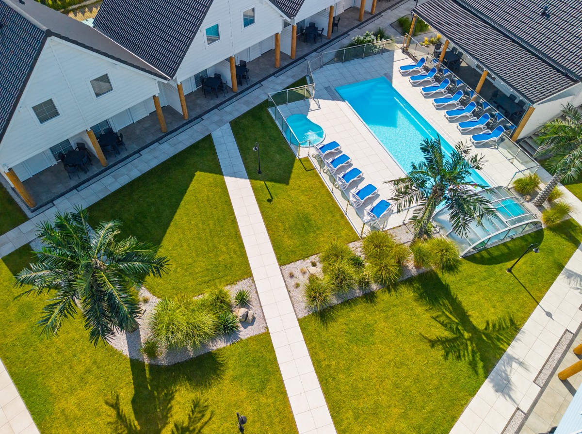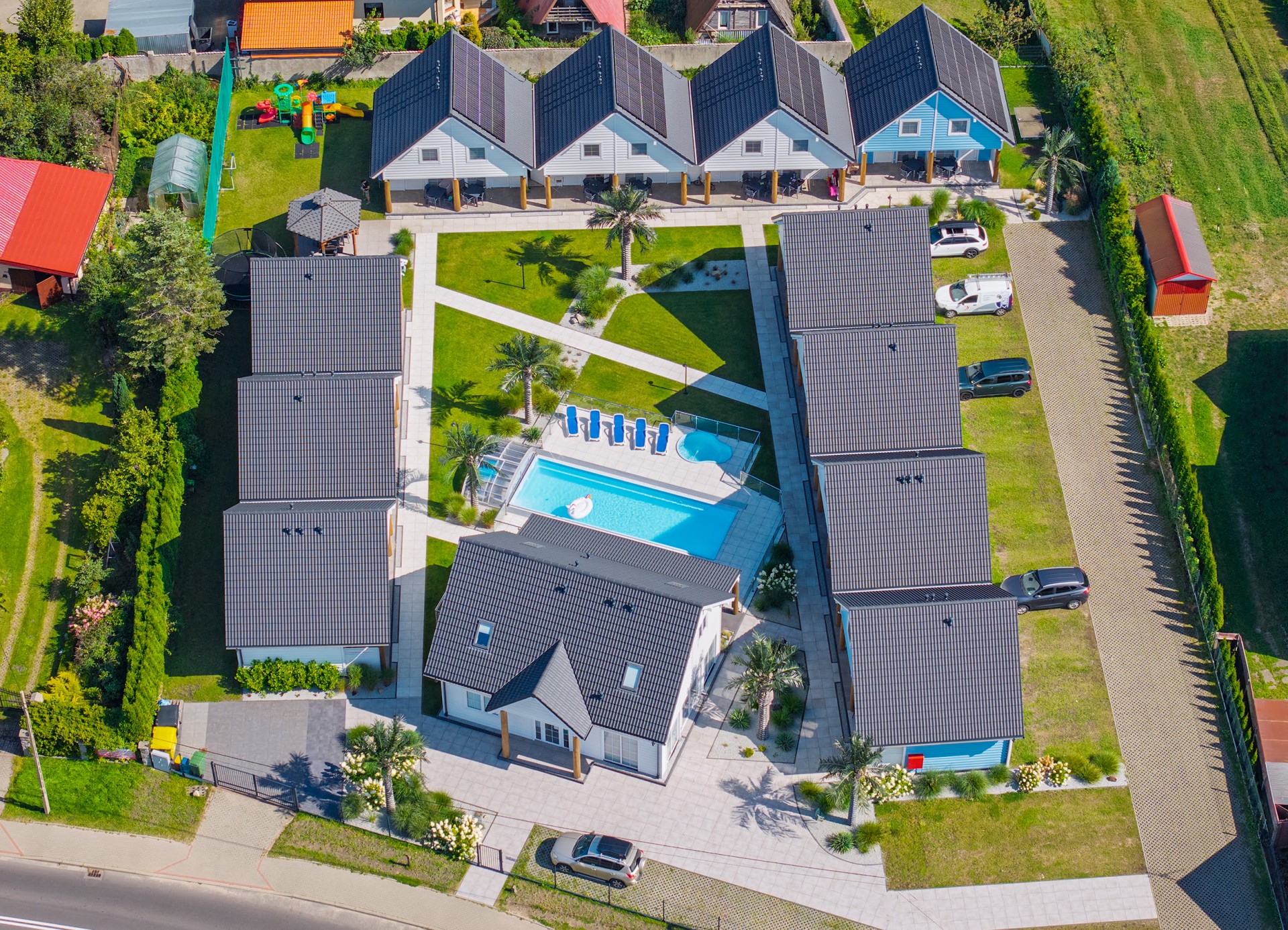 Zabudowa domków w kształcie litery "U" zapewnia każdemu domkowi widok na centralną część placu, na którym położony jest duży BASEN oraz mniejszy brodzik dla dzieci.