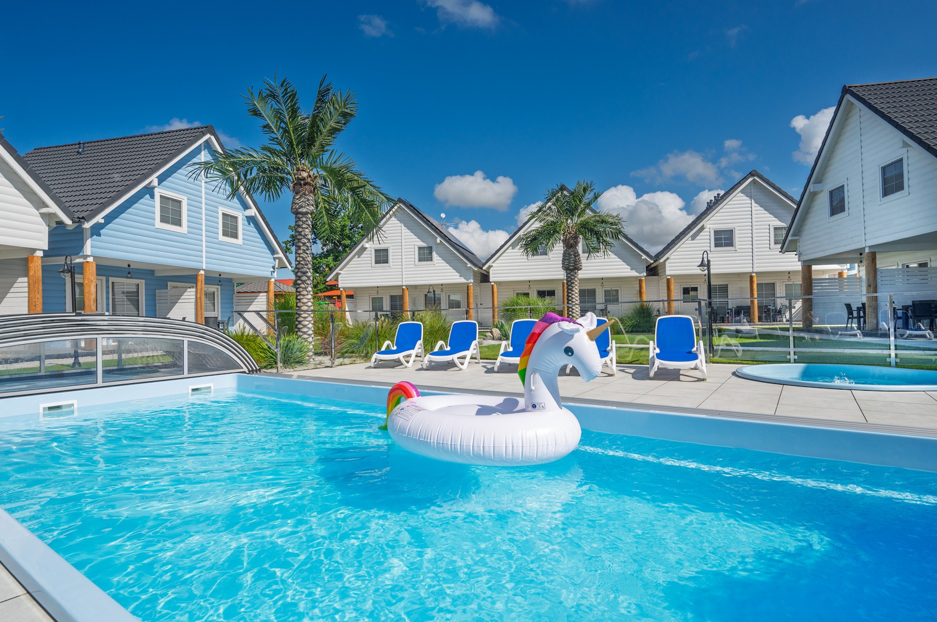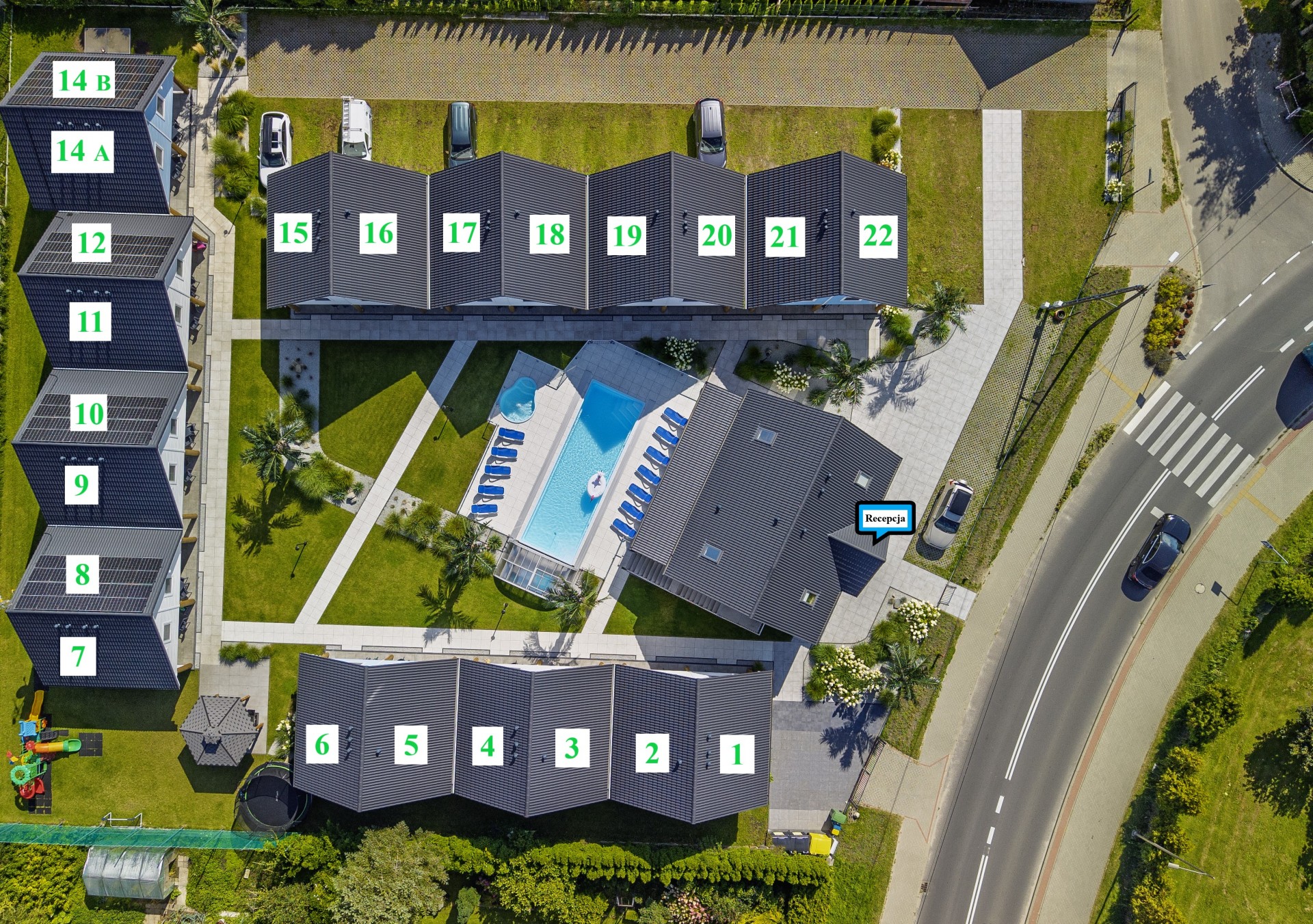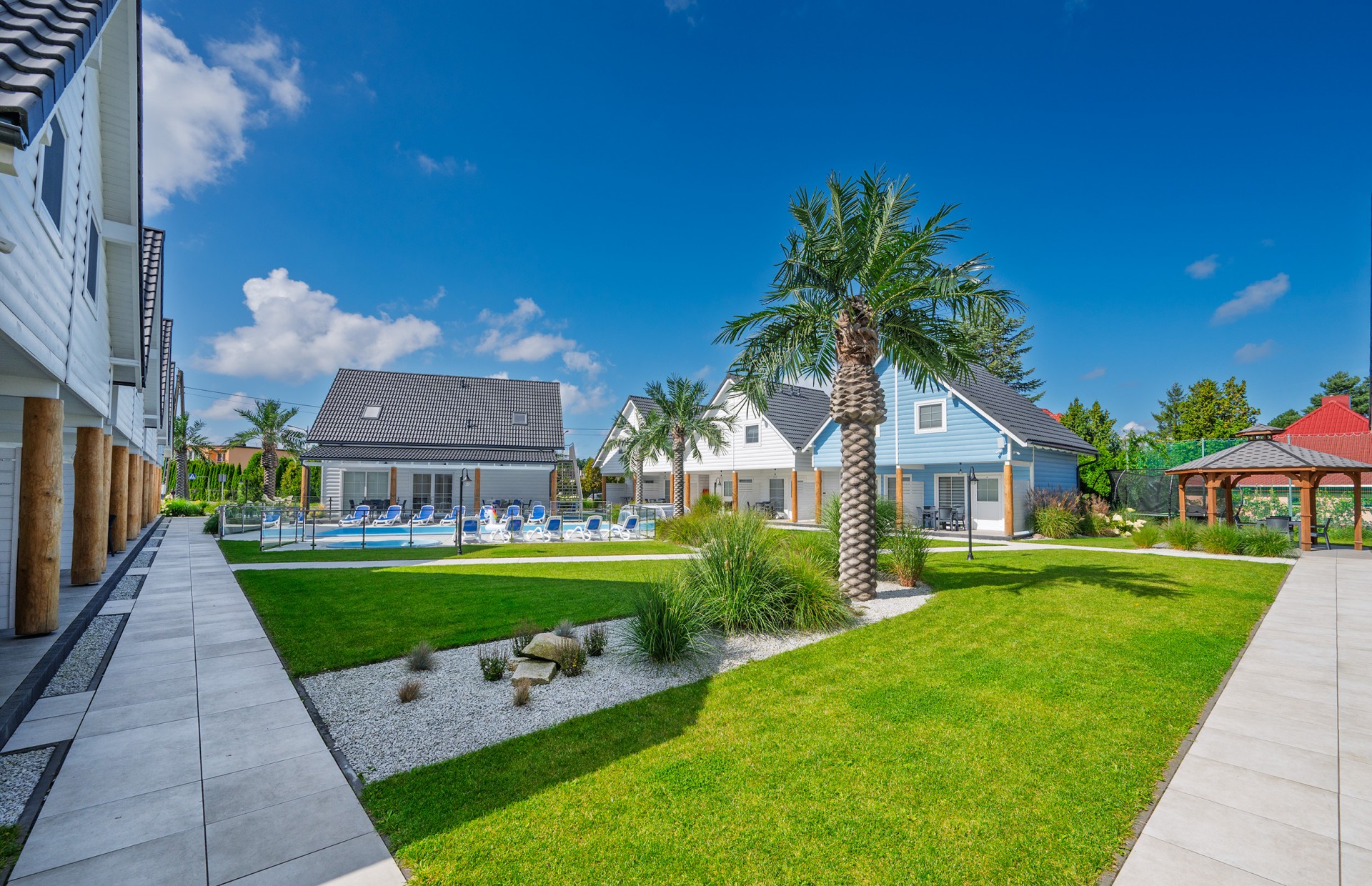 Zabudowa domków w kształcie litery "U" zapewnia każdemu domkowi widok na centralną część placu, na którym położony jest duży BASEN oraz mniejszy brodzik dla dzieci.